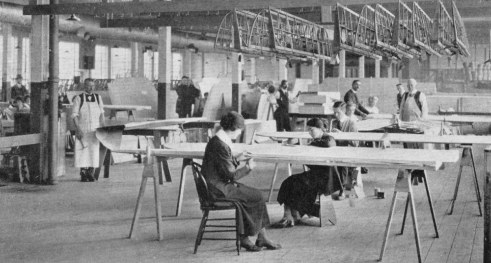 The actual work area was relatively small @ 20k sq.ft. in the fire damaged building consisting of wing assembly, covering and final assembly rooms. The wing spars were made of Alaskan spruce since an acceptable metal substitute couldn't be devised. The shaping of the metal frames was done at Hyde Park. After the wing frames had been assembled, they were taken to the covering room where they were double surfaced with strong gray Irish linen. This was sewed onto the ribs and then "doped" with a cellulose varnish which shrunk the cloth to drum tightness. Final assembly work included chassis assembly and finishing touches on the secondary guying, propeller mounting, etc.
