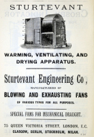 The English version of Sturtevant began its existence around 1884 after a visit to England by Benjamin Sturtevant for the purpose of establishing a foreign outlet to handle his European trade. As a result of negotiations, George Augustus Mower, an MIT grad from Wisconsin, started business on his own account under the name of Sturtevant Blower Co., on Queen Victoria St., London as an agent of the B.F.Sturtevant Co. In 1890, the name was changed to Sturtevant Engineering Co. Coinciding with the death of Benjamin Sturtevant, this name change signified the taking of legal control of what now was their subsidiary. Subordinate offices were located in Glasgow, Paris, Berlin, and Stockholm. In 1899, they incorporated as the Sturtevant Engineering Co. Ltd (SE).